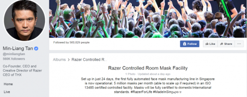 雷蛇创始人兼首席执行长陈民亮在社交媒体脸书上宣布,新加坡首个全自动口罩生产线已正式投入运作。雷蛇曾于本月1号承诺,将在30日内设立口罩生产线,如今仅仅用了24天,就已经完成了目标。